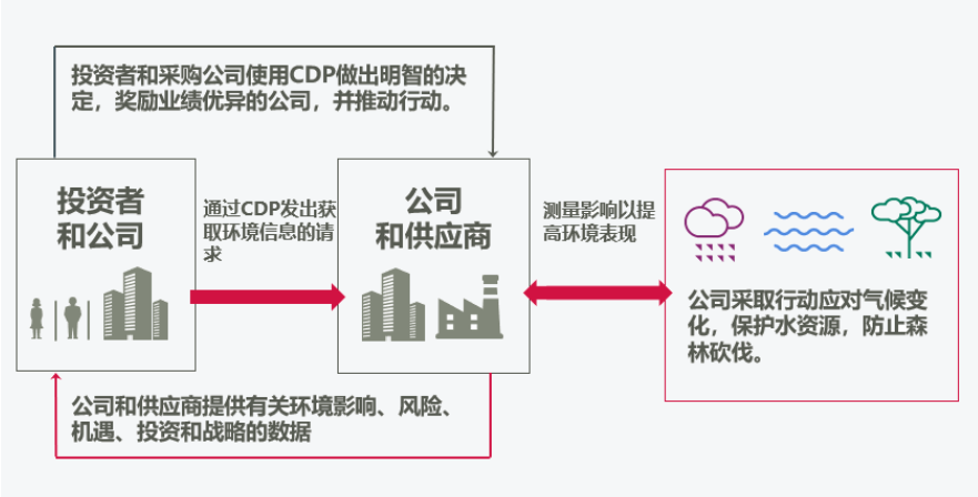如下图,投资者和客户通过CDP向公司和供应商发出获取环境信息的请求,公司和供应商通过CDP的线上回复系统进行相关信息的填报,经过CDP进行评级后将填报信息及评级返回给投资者和公司,以此做出相关决策来激励企业采取更多的行动来应对气候变化,保护水资源,防止森林砍伐。
